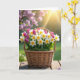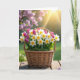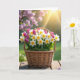 Designed with a rustic woven basket as the centerpiece, the scene shows a spring flower arrangement resting on a weathered wooden surface. The basket is filled with white-petaled blooms with sunny yellow centers, clustered close together like friends leaning in for a photo ❤️. Between them, tightly closed magenta-purple buds add contrast, as if shyly waiting their turn to open. A cushion of green moss at the base brings a soft, earthy texture that makes the flowers feel gently tucked in. If any greeting text is added, it would sit along the top in a light, airy green, with a smaller line near the bottom in warm yellow to match the flower centers 🌼. Soft afternoon light warms the wood grain and creates mild shadows beneath the basket, giving the arrangement a cozy, intimate look. In the background, a blurred green lawn fades into a pale pink haze of flowering trees, with a golden sunbeam entering from the upper right.