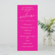 A magenta birthday party program with elegant fonts and a delicate calligraphy script writing welcome across the top of the program. Add your program, the date, and the name of the person celebrating their birthday.