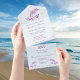 Invite guests to your upcoming wedding with a Magenta Dolphin All in One Wedding Invite. Invite design features a metallic styled dolphin against a muted ocean waves background adorned with elegant scrolls with a perforated RSVP card. Personalize with the groom and bride's names along with the wedding date and location. Additional wedding stationery available with this design as well.