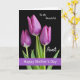 This card shows three closed flower buds in deep magenta fading into soft lavender, rising on slim green stems like a small trio leaning toward each other in quiet closeness ❤️. Curved green leaves unfurl around them, adding gentle motion against a solid black background that makes the blooms feel intimate and spotlighted. Soft lighting grazes the petals, bringing out a velvety look and fine lines that suggest they’re about to open. The buds sit centered in the design, spaced evenly so the eye moves from one to the next like a calm, shared moment between friends. Near the upper area, a short line of text appears in plain white lettering, with a second line beneath it in a flowing white style that feels more affectionate. Along the bottom edge, a wide horizontal purple band stretches across the card, holding another message in white text and echoing the flower tones 🌼. The purple band is flat and smooth, and above it the three buds glow softly against the dark backdrop.