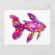 a colorful watercolor design of a very magenta colored goldfish swimming along on a postcard.