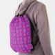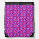 A pretty Drawstring Backpack, with a pattern of hearts and flowers on a magenta background. From a hand-painted paper collage, in the Folk Art Style, by Judy Adamson.