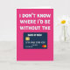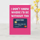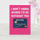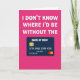 This greeting card features a rich magenta background that feels warm and affectionate ❤️. Across the top, chunky white 3D-style letters with soft shadowing stretch wide, giving the message a confident, friendly presence. The text reads “I DON’T KNOW WHERE I’D BE WITHOUT THE,” centered high on the page in bright white for strong contrast. Beneath it sits a dark indigo rectangle styled like a payment card, adding a humorous nod to a caring, supportive relationship. On the card face, “BANK OF MUM” appears in light lettering, alongside a small gold chip icon on the left, grouped number rows across the middle, and a tiny date-like line near the lower edge. Two overlapping circles in red and orange rest at the lower right of the card, like a familiar payment symbol without naming any brand 🌼. The overall layout is simple and balanced, with the white headline above and the deep-toned card graphic centered below on the magenta field.