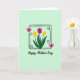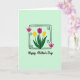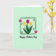 Designed with a gentle, celebratory look, this card features three stylized flowers standing close together like old friends leaning in ❤️. A rich magenta bloom sits in the middle, flanked by two sunny yellow flowers, all rising from deep green leaves that feel calm and steady. The bouquet is contained inside a dark green rectangular frame, with small curled corner details that add a soft, affectionate touch. The background is a pale mint green, like a quiet spring morning that makes the colors feel even warmer. Two small pink blossoms drift outside the frame—one near the upper left and one near the lower right—adding a light, caring balance 🌼. Beneath the framed flowers, a short message appears centered near the bottom in black flowing lettering. The dark green border has thin lines and subtle curl accents tucked neatly into each corner.