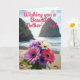 Soft colors and a sunlit bouquet of daisy-like flowers fills the foreground, with petals in soft pink, deep purple, bright magenta, and crisp white gathered close as if arranged for someone special ❤️. Dark, round centers and fine petal textures stand out under gentle light, giving the blooms a fresh, just-picked look. Behind them, the scene fades into a calm shoreline where pale sand meets small, shimmering waves, creating a quiet, unhurried backdrop. Farther out, large rocky formations rise from the water, softened by a light haze that makes the distance feel dreamy and calm. Across the upper area, a flowing line of fuchsia lettering stretches prominently, like a warm note written above the view. The placement leaves the flowers unobstructed, so the message feels like it’s floating over the bouquet and sea. The contrast between sharp blossoms and the softly blurred beach adds a tender, affectionate mood, like a shared walk by the water 🌼. In the luminous distance, the ocean glints beneath the hazy rock shapes while the bright fuchsia text sits centered near the top.