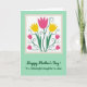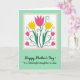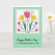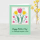 This card features a minimalist floral illustration set inside a soft light-beige frame on a gentle mint-green background. Inside the frame, a white panel holds a bouquet of stylized tulip-like flowers arranged with a sweet, balanced symmetry that feels like a quiet hug ❤️. A rich magenta bloom sits at the top center, flanked by two bright daffodil-yellow flowers that lean inward as if sharing a private moment. Below them, smaller magenta blossoms spread out in an even row, supported by dark green stems that cross and intertwine like close friends linking arms. Curving tendrils spiral outward from the stems, adding a light, romantic motion to the otherwise simple layout 🌼. Centered beneath the framed bouquet, a short greeting appears in dark green, with the text placed low on the page against the mint background. The frame’s thin border stays pale and understated, while the magenta and yellow petals stand out sharply against the white interior panel and deep green foliage.