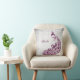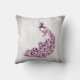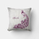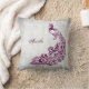 This Magenta Peacock Personalized Throw Pillow is a visually striking item, featuring a vibrant metallic peacock with iridescent feathers shimmer with magenta tones, creating a bold and luxurious focal point. Set against a gray grunge background, adorning the design are delicate white leaf botanicals, intricately woven around the peacock. These leaves, rendered in crisp, clean lines, resemble delicate vines, adding a touch of elegance and nature-inspired softness, softening the grunge background’s roughness while complementing the peacock’s regal presence. Elegant script allows you to add your name or recipient's name for a more personalized home decor gift.