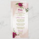 Beautiful wedding menu card featuring magenta and pink flowers and green leaves