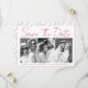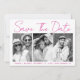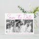 Magenta pink and white script calligraphy three photo collage Save the date card. The backside includes a fuchsia pink and white pattern with the couple's names.