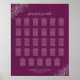 This beautiful wedding seating chart features a simple yet elegant design with pale gray text on a cassis purple, magenta, plum, or berry colored background. There are fancy silver faux foil frills or floral filigree in the corners and a script calligraphy title reading "please find your table." The chart has table assignments for 290 guests at 29 tables (10 seats per table.)