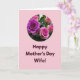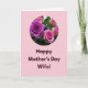 Designed with a soft rosy-pink background, this card centers on a circular floral scene near the top that feels quietly romantic. Inside the circle, a rich magenta‑purple rose with tightly spiraled petals takes the spotlight, surrounded by lighter pink roses in full bloom and small buds. Gentle green leaves peek between the flowers, adding depth and a natural, close-together look, like a bouquet held near the heart ❤️. The lighting appears diffused and calm, bringing out velvety textures and subtle shifts in petal color without harsh shadows. Beneath the circle, the message “Happy Mother’s Day Wife!” sits in the lower half in dark burgundy lettering that stands out against the pink field. The text is centered and easy to read, balancing the floral artwork above with a direct, affectionate tone 🌼. The circular vignette is positioned in the upper portion, with the deepest purple bloom slightly off-center among the surrounding pink roses and greenery.