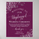 This beautiful "Unplugged" sign that serves as a delightful greeting for your wedding guests while also requesting them to switch off their phones, cameras, and gadgets, ensuring a seamless and uninterrupted ceremony. The sign showcases an elegant magenta or cassis purple and silver design with graceful cursive calligraphy and elaborate silver gray faux foil curls and swirls adorning the corners. The message reads: Welcome to our unplugged Wedding Ceremony. Please turn off your Phones, Cameras and Devices So we can all enjoy the Ceremony without Disruptions.