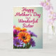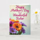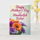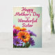 This greeting card features a soft gradient background that shifts from pale cream at the top to gentle mint green below, giving the scene a calm, caring feel. Near the upper area, the message “Happy Mother’s Day to a Wonderful Sister” is placed prominently in deep fuchsia lettering, standing out clearly against the light backdrop. Beneath the text, a full bouquet of daisy-like flowers fills the lower half, arranged close together like a friendly hug ❤️. The petals show a mix of orange, magenta, and violet tones, with dark, textured centers that add contrast and draw your eye. The closest blooms are sharply detailed, making the petals look velvety and fresh, while the flowers farther back fade into a softer blur for depth. Subtle lighting and the close, clustered arrangement suggest a tender, sisterly bond, like a shared laugh captured in color 🌼. At the bottom edge, overlapping blossoms create a layered field of bright petals with crisp foreground detail and a gently softened background.