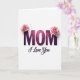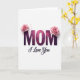 This greeting card features large three-dimensional letters spelling “MOM” centered on a wide white background, filled with swirling magenta and deep plum patterns that look like soft clouds. Two fully opened flowers in gentle pastel pink rest on the top edges of the first and last letters, like a sweet embrace framing the word ❤️. Light, translucent pale-pink paint splatters float around the blossoms, adding a soft, artsy touch that feels like a warm hug between close hearts. Beneath the big word, the smaller message “I Love You” sits centered in a flowing dark gray-to-black cursive style, giving the layout a tender, intimate balance. The thick letterforms cast subtle shadows that make them feel raised, while the textured color inside them shifts from lighter magenta to deeper plum. The overall spacing is airy, with the main word taking the visual spotlight and the smaller line tucked neatly below it. The flowers show layered petals with faint highlights, and a few tiny pink specks dot the white space near the top corners 🌼.