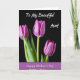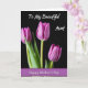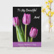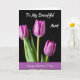 Designed with three richly colored tulips in magenta-purple, the card places their slightly closed petals in a gentle upward arrangement that feels like a quiet gesture of affection ❤️. A deep black background surrounds the flowers, making the soft light on their ribbed petals and curved edges feel intimate, like a close moment shared between friends. The stems and small leaves are a fresh green, adding a calm contrast that keeps the bouquet grounded. White lettering appears near the top and again near the lower area, floating over the dark space so the message stands out without crowding the flowers. The text is light in color and airy in placement, leaving the tulips as the main focus while still guiding the eye from top to bottom. At the bottom, a rich purple band stretches across the base, echoing the tulip tones and adding a neat finishing edge 🌼. The shadows stay deep around the bouquet, and the purple band sits flush along the lower border beneath the green stems.