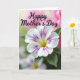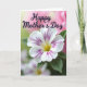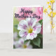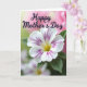 Designed with a close-up flower as the main focus, this Mother’s Day card centers on white petals traced with deep magenta veins that draw the eye inward like gentle arms around a loved one ❤️. A soft yellow center glows warmly, while slightly blurred green leaves sit behind it, adding calm contrast. The background fades in a smooth gradient from rose-pink into a light, misty green, giving the scene a quiet, affectionate atmosphere. Across the upper area, the words “Happy Mother’s Day” appear in flowing purple lettering that echoes the petal veins without taking over the image. The text sits clearly above the bloom, with enough open space around it to feel airy and easy to read. The lighting looks diffused and tender, bringing out the petal texture and creating a cozy, caring mood 👩. The purple message stretches near the top edge, floating over the pink-to-green background just above the flower.