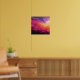 This vibrant poster features abstract artwork, dominated by a swirling blend of colors that evoke a sense of movement and depth. Starting from the top, there's a section of deep purple that transitions into shades of pink and magenta. As the colors cascade down, they morph into warmer tones of orange and yellow, creating a visual gradient. The bottom of the image features darker hues, almost black, providing a stark contrast to the lighter, brighter shades above. The overall effect is reminiscent of a sunset with the colors blending and merging in a fluid, organic way. The texture appears to be smooth and glossy, enhancing the visual appeal of the artwork.