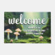 The background evokes a fairytale forest scene with muted greens, yellows and smokey blues. Mossy trees are decorated with delicate mushrooms in a complimentary white and soft pink color scheme. Bold white text reads "welcome" across the top. Easily update test template to a teacher or family name or classroom title. Maybe there's enough room for a cute joke? It's yours to customize. Available in many other backgrounds, colors and designs.