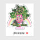 A sheet of 1 clear peel off sticker with a graphic illustration of a beautiful rainbow colored haired fairy with pretty blue eyes clutching a unicorn bag walking across a garden filled with pretty string lights, sakura cherry blossoms, a colorful rainbow and magic fairy dust. She has a pink template below her for your name. Ideal for little girls birthday party favor packs or for school books and lunch boxes.