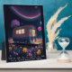 Whimsical tabletop art for book lovers features AI generated digital art dreamscape with a illuminated bookmobile in a field of flowers under a night sky. "Meet me under the stars and we can read all our favorite banned books together" text can be customized to your own special message