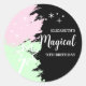 Magical kids birthday with stars and bubbles coming from a star shaped wand against a light pink and mint green background.