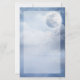 Stationery paper with a magical fantasy sky with fluffy blue clouds and a big beautiful moon. 2 white swans flying off together.
