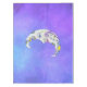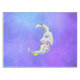 This table cloth has a magical white crescent moon with colorful decorations including circles, triangles in blue and yellow with a purple scroll and a pretty face in the center of a purple sky background with tiny white stars.
