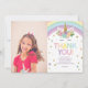 This is a unicorn and rainbow themed birthday party thank you card w/ picture.
