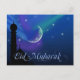 Eid Greeting illustration with a magical evening sky scene: silhouette of a mosque on a blue night sky with shiny stars and moon.