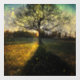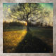 Digital composition of many personal photographs creating a magical dreamy scenery of fireflies around tree with shining light.