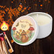 The lid of each candle tin showcases a captivating scene from the enchanted autumn forest, ready to be personalized with 'Thank You Olivia's BABY SHOWER' and the date. The whimsical design features an adorable fox creature, charming mushrooms, a sweet bird, and a snail in an acorn house, all set against a warm, sun-kissed background with delicate autumn leaves.