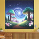 This magical and whimsical digital artwork portrays a gateway to a world of dreams. The centerpiece is a stunning swirling galaxy, radiating soft blue and pink light in the tranquil night sky. In the foreground, two distinct and uniquely shaped whimsical trees stand, guarding a winding path that leads into the distance. Gentle green hills and scattered pink flowers add a cozy, fairy-tale touch.