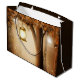 Gift bag with a whimsical enchanting illustration in rich brown and yellow colors. A magical mystical forest with a large tree holding an old fashioned lantern. Fairy lights dancing all around. An enchanting wonderful design.