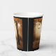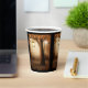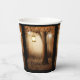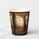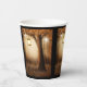 Paper cups with a whimsical enchanting illustration in rich brown and yellow colors. A magical mystical forest with a large tree holding an old fashioned lantern. Fairy lights dancing all around. An enchanting wonderful design.