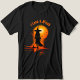 This magical Gothic Valentine’s Day T-shirt design features the silhouette of a witch standing against a glowing orange moon. The design includes a shadowy reflection of the witch below and a background with bats flying in the night sky. The text at the top, “I Love A Witch,” can be personalized to suit the wearer’s preference, making it a fun and festive choice for someone celebrating Valentine’s Day with a witchy vibe.