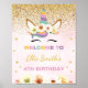 Welcome your guests with sparkle and magic using this gold glitter unicorn welcome sign! Featuring a majestic unicorn with shimmering gold accents and soft pastel colors, this design is perfect for unicorn-themed birthdays, elegant celebrations, or fantasy parties. The text is fully editable, so you can personalize it to fit your special event.