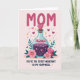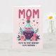 Designed with a vertical layout, the card opens with the large word “MOM” at the top in deep pink, setting a loving tone right away ❤️. In the center, a clear glass potion bottle in soft teal holds a dark violet liquid that feels like a secret shared between close hearts. Inside the bottle, small pink hearts and tiny white stars float upward, like affectionate notes rising in a quiet, romantic moment. A pink heart-shaped stopper tops the bottle, echoing the scattered little hearts and golden starbursts sprinkled around the background. The backdrop is a gentle blush tone, keeping the scene light while letting the richer colors stand out. Along the bottom, dark green leaves frame two pink flowers with bright yellow centers, adding a fresh, garden-like touch 🌼. Beneath the illustration, the phrase “YOU’RE THE SECRET INGREDIENT TO MY HAPPINESS” appears in a flowing dark font with small golden highlights. The bottle shows glossy reflections and soft shadows, with the teal glass edges catching light against the pale pink background.