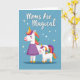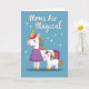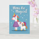 Designed with a calm sky-blue background, the illustration centers on two white, horned fantasy horses standing close together like a caring parent and child ❤️. The taller one wears a simple flowing purple outfit and leans slightly toward the smaller one, creating a gentle, protective closeness in their pose. Both have rainbow-colored manes and tails, pink cheeks, and small smiles that feel like a quiet, affectionate moment shared between them. A short message reading “Moms Are Magical” sits across the top in white lettering, spaced wide so it floats above the figures. Tiny white dots and star-like bursts are sprinkled around the upper area, adding a soft sparkle without crowding the scene 🌼. The colors are flat and bright with light shading under the figures to keep them grounded against the open background. Their golden spiral horns catch the eye near the center, shining against the cool blue sky and the purple clothing. The rainbow strands flow outward in smooth curves, with the tails sweeping down and to the side in layered bands of color.