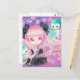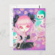 Cute kawaii girl with flowing pink ponytails tied with black bows, in a black dress, with two adorable aqua blue owls, magical stars, and pastel Autumn leaves.