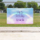 Birthday banner with a soft and lovely background image. Pastel blues and pink clouds with a magical rainbow.