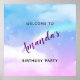 Welcome birthday poster with a soft and lovely background image. Pastel blues and pink clouds with a magical rainbow.