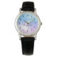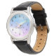 A watch with a soft and lovely background image. Pastel blues and pink clouds with a magical rainbow.