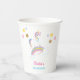 Cute personalized unicorn birthday party paper cups. This fun custom design features a sweet unicorn illustration, stars and a rainbow. Trendy pink, purple, blue and yellow colors with a touch of faux gold glitter.