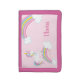 A cute unicorn wallet with stars and a rainbow on a light pink background. Personalize with her name to make a fun gift for a little girl.