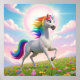 The unicorn is prancing through a lush, green meadow with small, colorful flowers in shades of pink, purple, yellow, and blue.