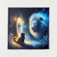 A mystical night scene with a fluffy black cat gazing into a glowing mirror, where its reflection appears as a majestic white lion. Both animals, with detailed, shimmering fur, lock eyes in a striking contrast. The scene is illuminated by a warm orange and cool blue light, surrounded by star-like specks and a frosted texture, creating an enchanting atmosphere.