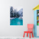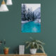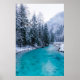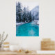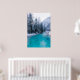 Landscape photograph of a blue magical river in a snowy covered winter forest.
