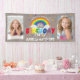 Fun, colorful rainbow themed children's birthday banner, personailzed with two photos of the birthday girl or boy. Rustic wooden background with a magical rainbow, clouds, a scattering of multi-colored stars and a birthday banner template that can easily be customized.