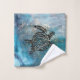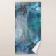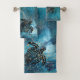 On this dreamy blue towel set are paint strokes shades of blue and with shimmery and glittery overlays creating whimsical magical modern art along with a black tribal swirl sea turtle with gold glittery drops on the top and bottom of the towels for added whimzy.