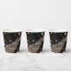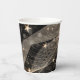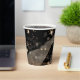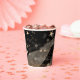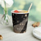 Beautiful festive paper cup design featuring stylized gold stars, strings and bokeh on black background.
